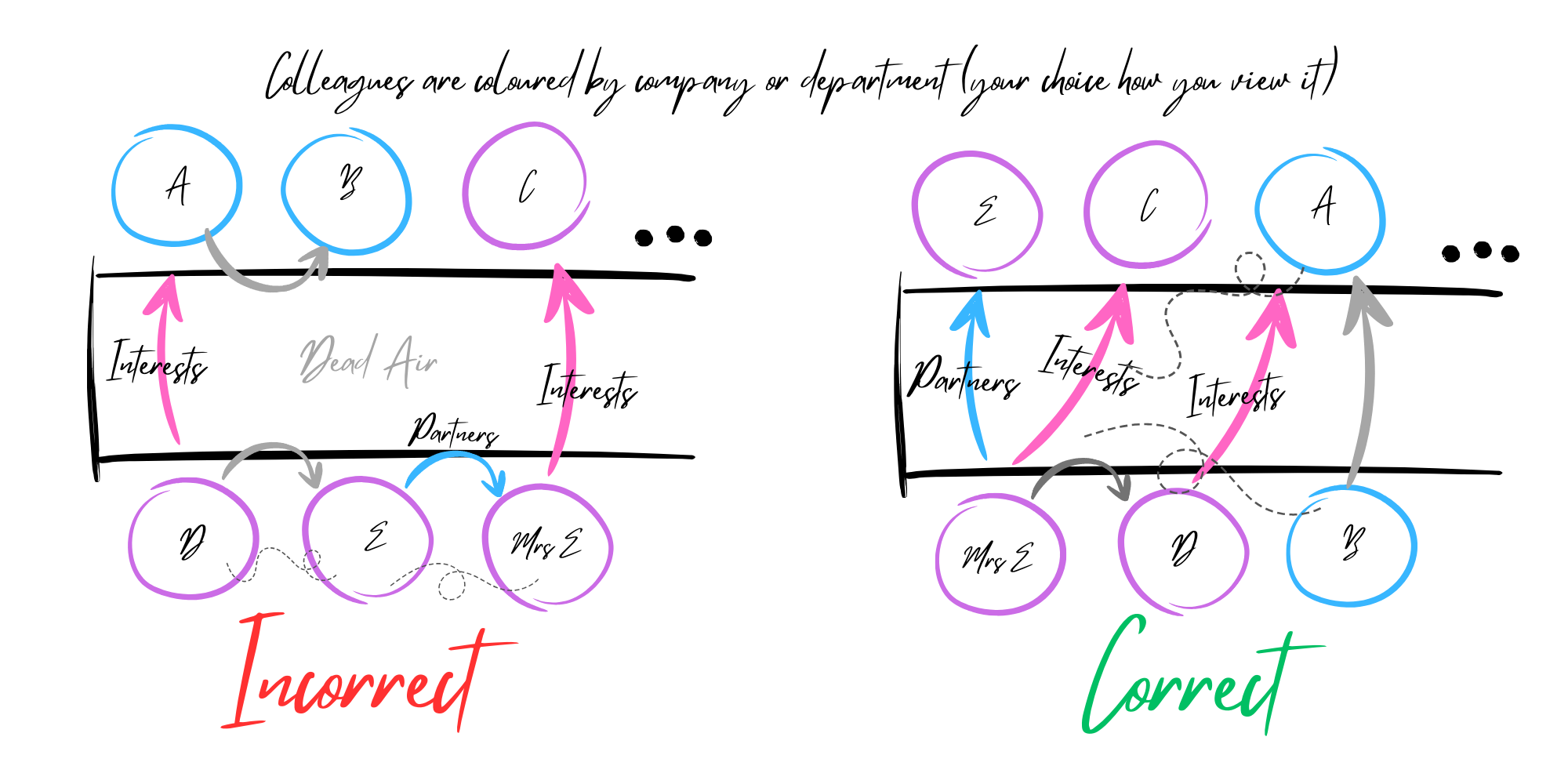If you wanted to take this to the next level, speak to collague C before the event and get them to ask B about a particular story… or let colleague D know that A shares an interest.